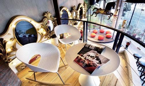 門口棧道旁邊的咖啡杯上,如果有一男一女坐著聊天,大家可別把他們誤會成一對情侶,他們更多的是在談工作。經過前臺,客戶主任E m m a告訴南都記者,除了正門旁邊那個彌漫古典氣息的會客室外,夾層的閱覽室、二樓的露天茶座……辦公室里隨處都能開會,其中最為吸引人的就是正對門口的兩個摩天輪包廂。